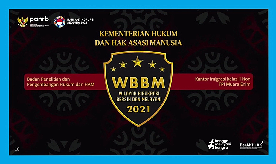 Integritas (ZI) menuju Wilayah Birokrasi Bersih dan Melayani (WBBM). Apresiasi dan Penganugerahan ini diberikan oleh Kementerian Pendayagunaan Aparatur Negara dan Reformasi Birokrasi (Kemenpan RB) pada Senin (20/12/2021) pertemuan secara virtual.
