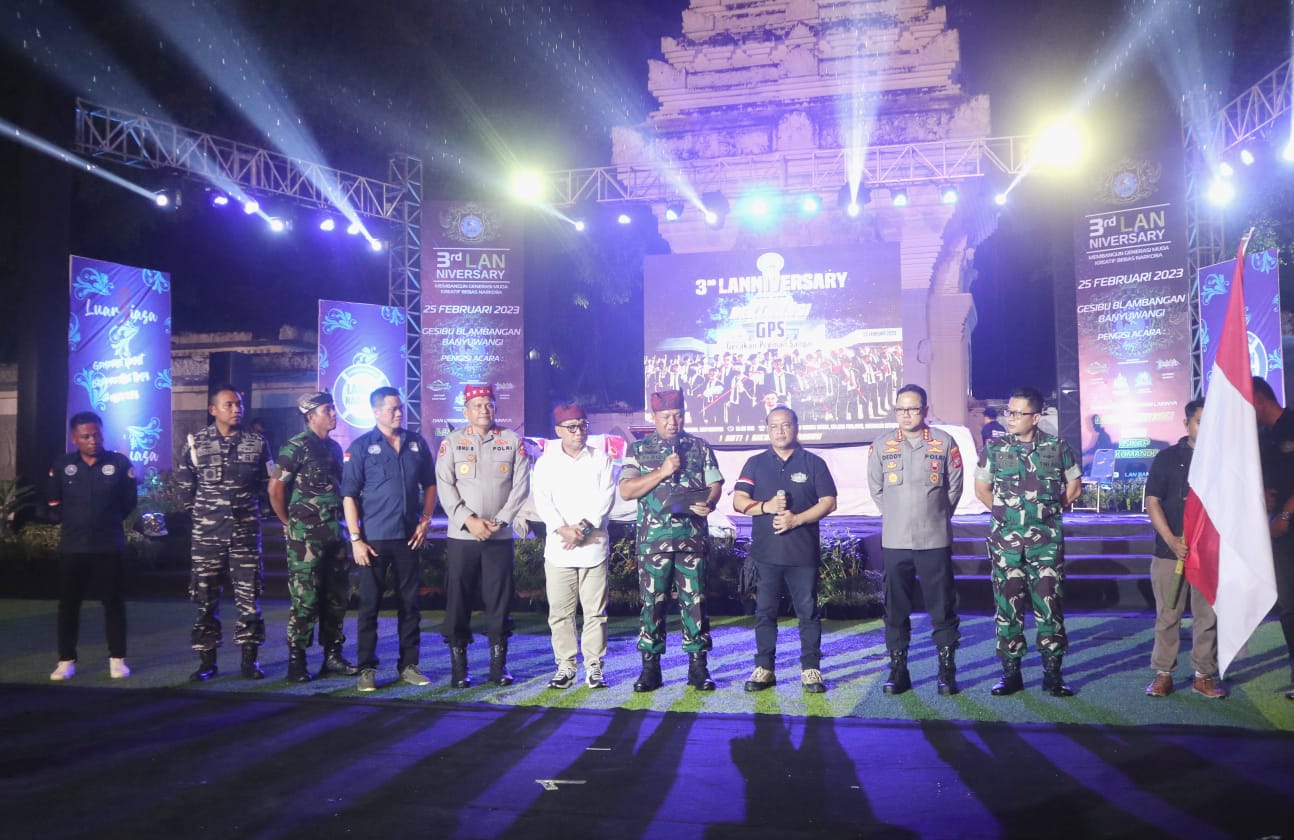 Banyuwangi, Potensinusantara – Pangdam V/Brawijaya Mayjen TNI Farid Makruf, M.A., Deputi Bidang Penindakan dan Pembinaan Kemampuan BNPT RI, Irjen. Pol. Ibnu Suhendra, S.I.K., dan Forkopimda Banyuwangi ikut serta dalam deklarasi Gerakan Preman Sangar (GPS) saat HUT Ke-3 LAN Banyuwangi, Sabtu (25/2/2023) malam.