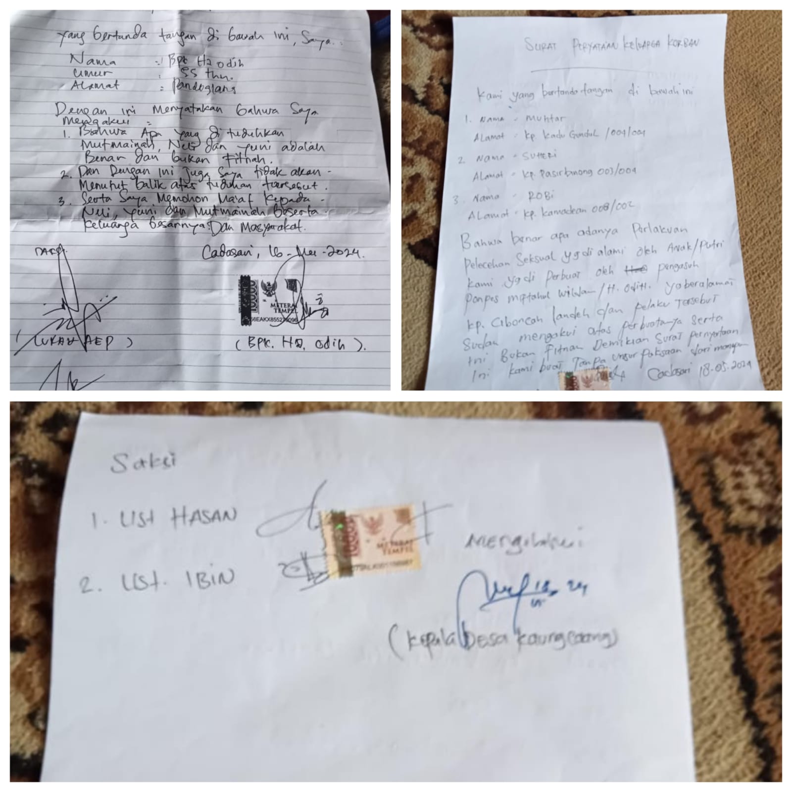 BANTEN – potensinusantara.co.id – Laporan santri korban pelecehan seksual yang di duga dilakukan oleh pengasuh pondok pesantren di Pandeglang Banten, tidak juga menemukan titik terang, pasalnya 3 hari laporan itu tidak juga diterbitkannya Laporan Polisi (LP) dari pihak Unit PPA Polres Pandeglang Banten, akibatnya selain membuat geram masyarakat Pandeglang juga menimbulkan persepsi miring, para tokoh masyarakat dan masyarakat di Pandeglang Banten. Bahkan pelaku pun sudah membuat Pernyataan pengakuan pelecehan yang ditandatangani nya diatas materai. Kasus yang viral seminggu terakhir ini, sempat membuat heboh para alim ulama, tokoh masyarakat dan tokoh agama hingga MUI, Selasa 21 Mai 2024.