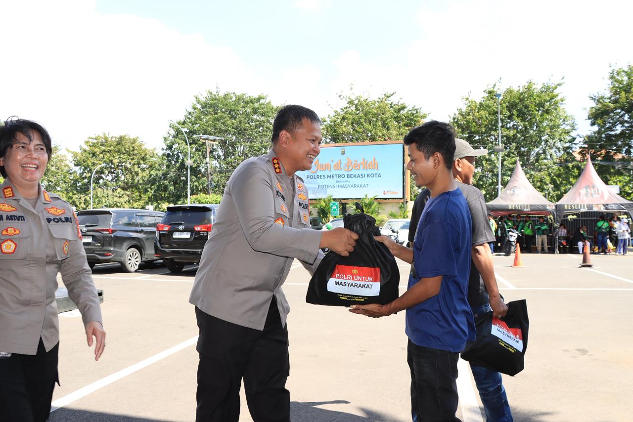 Kota Bekasi , potensinusantara.co.id– Kepedulian terhadap masyarakat kembali ditunjukkan Kapolres Metro Bekasi Kota Kombes Pol Kusumo Wahyu Bintoro melalui aksi sosial “Jumat Berkah” dengan membagikan 100 paket sembako gratis kepada warga dan pengemudi ojek online (ojol), Jumat (24/4/2026).