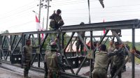 Prajurit Yonzipur 16/DA Kodam Iskandar Muda melaksanakan pemasangan Jembatan Belly