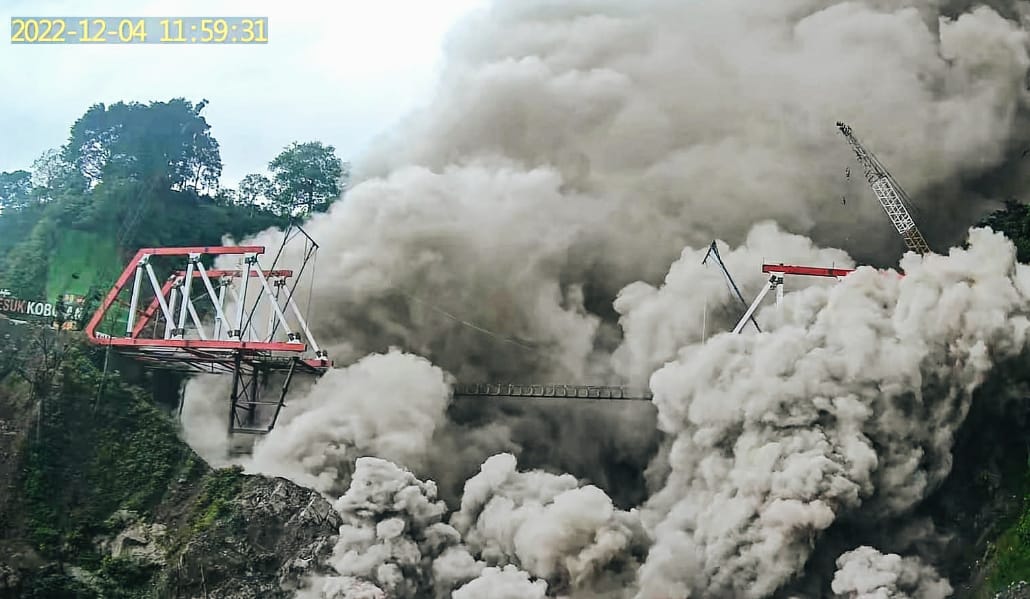 Lumajang, potensinusantara.co.id – Tercatat pada pukul 11:59:31 WIB, hari Minggu (4/12/2022), Awan Panas Guguran (APG) letusan Gunung Semeru telah sampai di Jembatan Gladak Perak, Lumajang, Jawa Timur. Bahkan jembatan yang baru dibangun itu terlihat seperti tertelan awan panas.