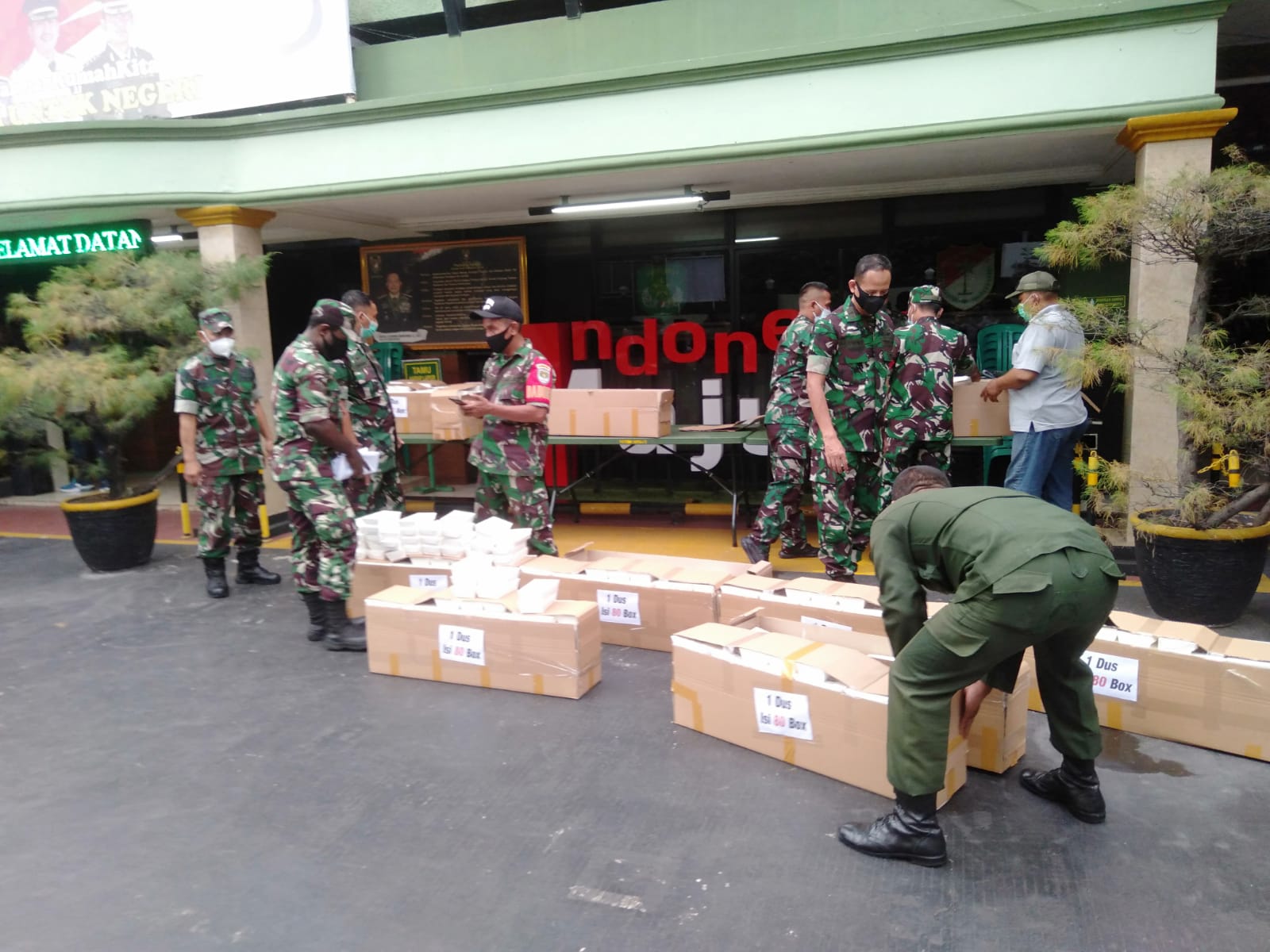 “Kami distribusikan nasi siap saji ini sebanyak 1250 box kepada koramil-koramil untuk selanjutnya di bagikan kepada waraga masyarakat di wilayah masing-masing.”Kata Dandim