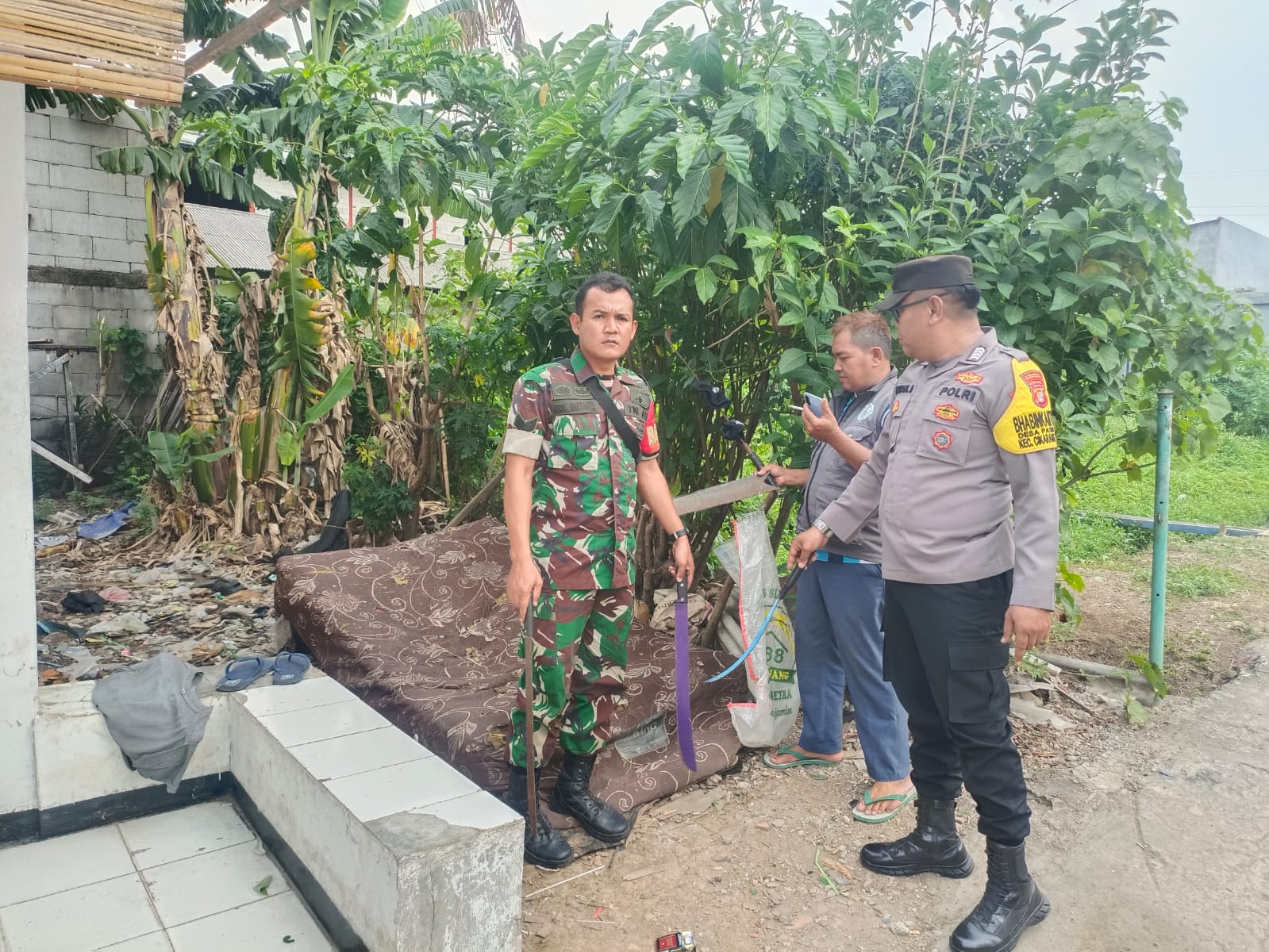“setelah mendapat laporan dari warag, saya bersama babinsa pengecekan di lokasi, kami menemukan senjata tajam lainnya yang disembunyikan di bawah kasur bekas yang telah dibuang,” jelas Bripka Apriansyah.