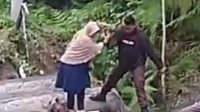 Bripka Syahid rela badannya diinjak oleh seorang ibu dan anaknya saat ingin melintasi jalan yang terputus akibat bencana longsor di Kecamatan Sengkongkang, Sumbawa Barat, Nusa Tenggara Barat.