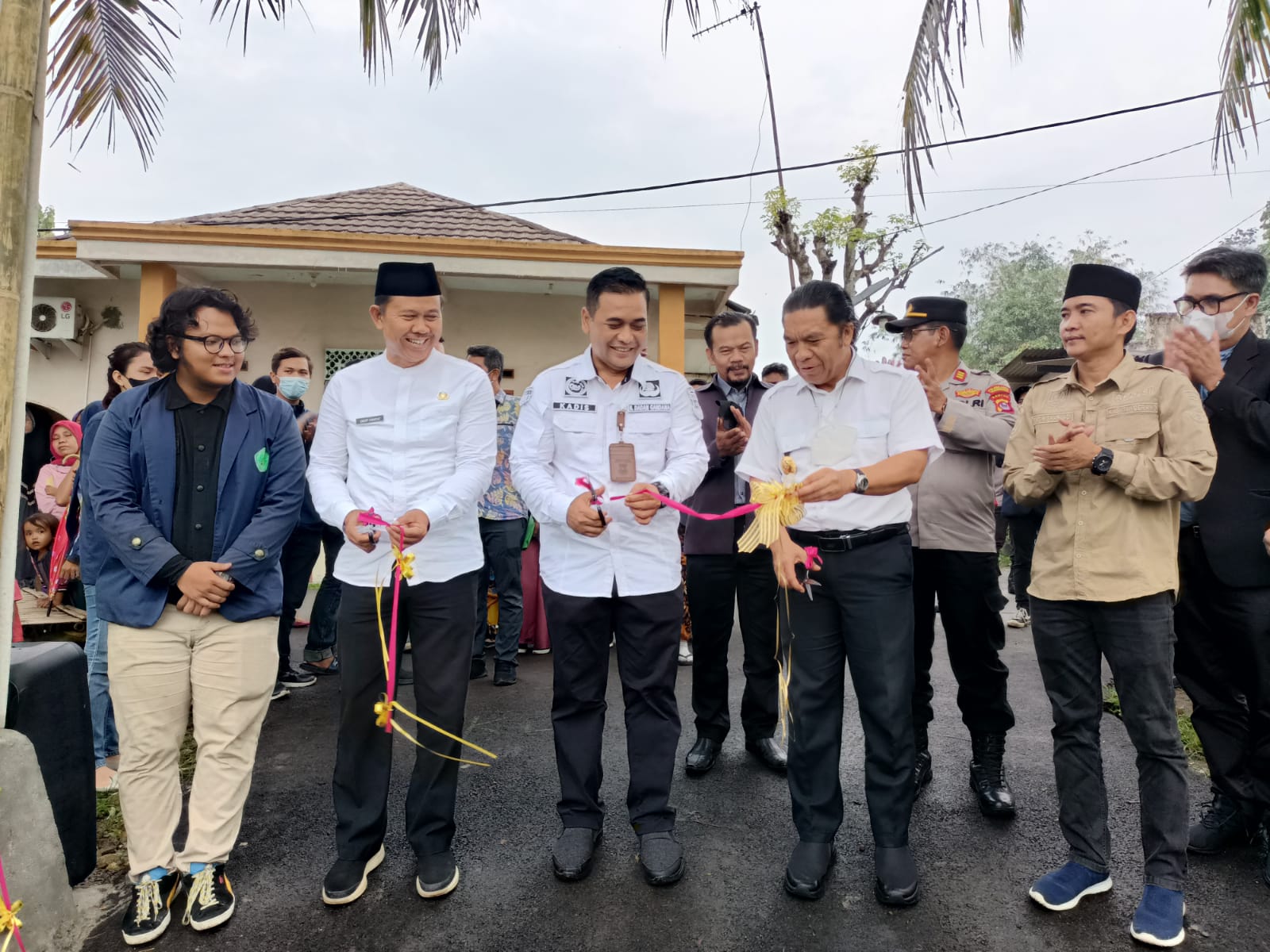 Penjabat Gubernur Banten yang didampingi Kepala DPMPD Kabupaten Tangerang dan Camat Cisoka bersama-sama menggunting pita peluncuran Kampung Tematik Serai Wangi.