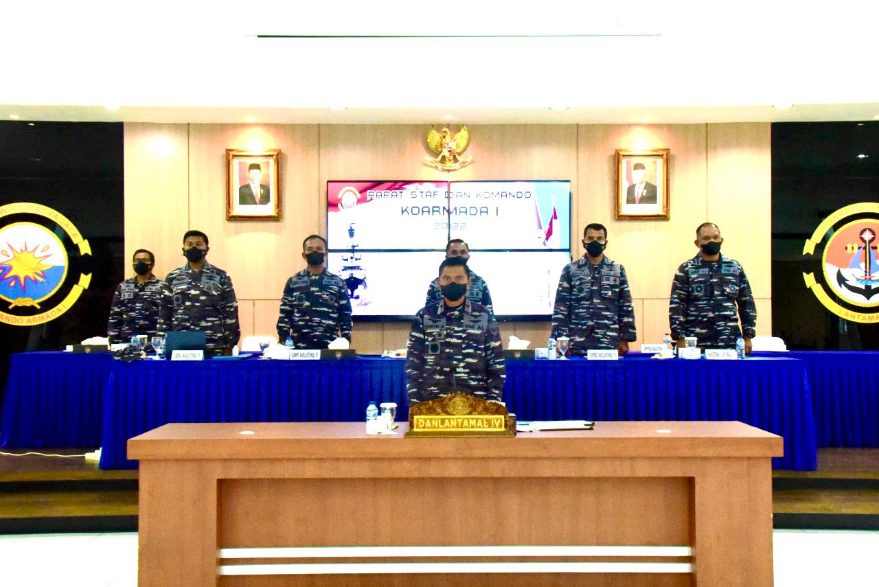 TANJUNGPINANG, potensinusantara.co.id- Komandan Pangkalan Utama TNI Angkatan Laut IV (Danlantamal IV) Laksamana Pertama TNI Dwika Tjahja Setiawan, S.H., M.H., M.Tr.Opsla menghadiri Rapat Staf dan Komando (Rasko) Komando Armada I (Koarmada I) secara virtual di Aula Yos Sudarso Markas Komando (Mako) Lantamal IV Jl. Yos Sudarso No.1 Batu Hitam, Tanjungpinang, Kepulauan Riau, Kamis (10/03/2022).
