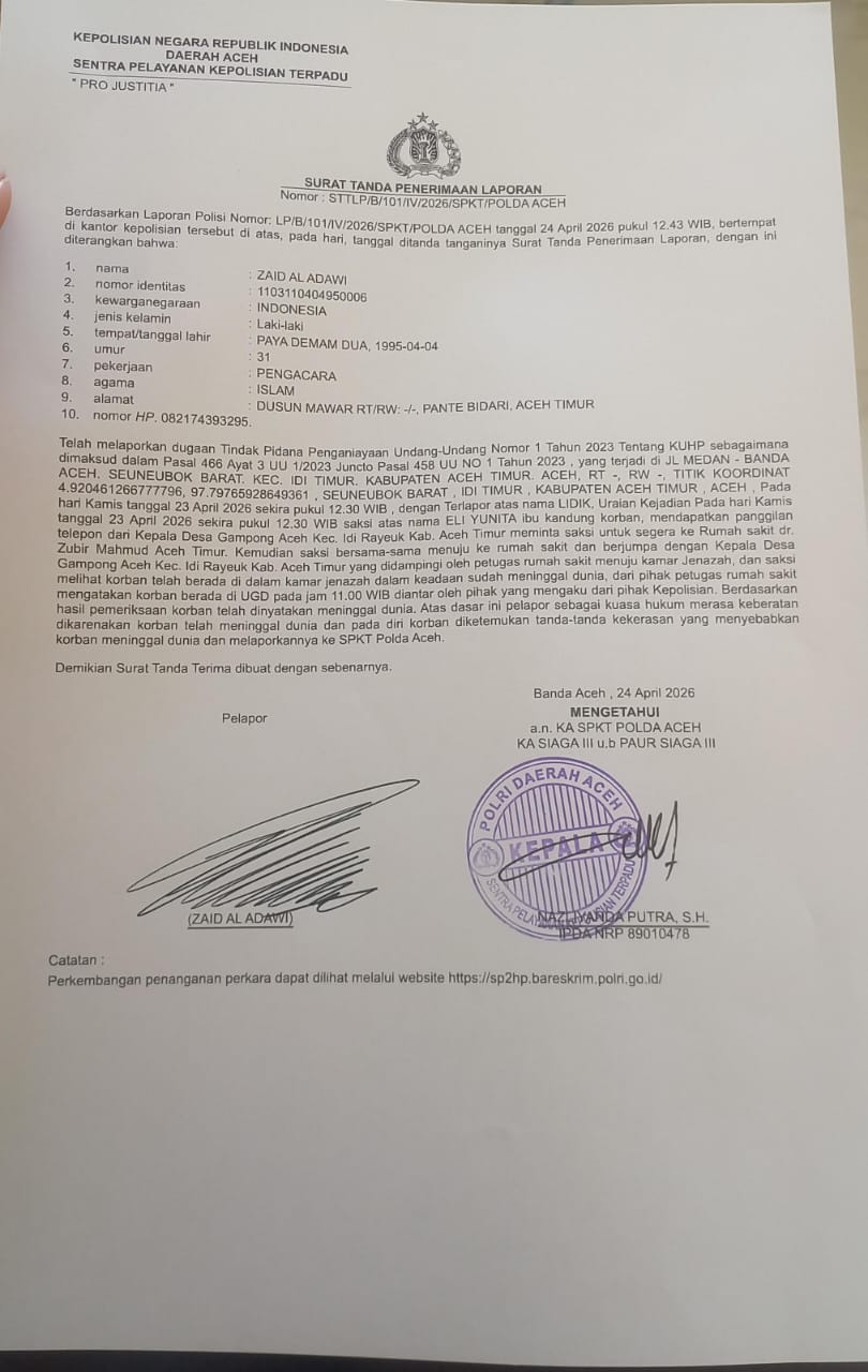 Aceh Timur, potensinusantara.co.id – Kematian seorang Pemuda bernama Muhammad Al Farizi warga Gampong Aceh Idi Rayeuk Aceh Timur pada 23 April 2026 menjadi sorotan public setelah pihak keluarga menduga adanya unsur penganiayaan yang menyebabkan kematian korban atau pembunuhan. Keluarga tidak terima atas peristiwa tersebut, kini pihak keluarga melalui kuasa hukumnya Zaid Al Adawi, S.H., melaporkan perkara tersebut ke Polda Aceh sesuai surat tanda bukti lapor Nomor : STTLP/B/101/V/2026/SPKT/POLDA ACEH tertanggal 24 April 2026, dengan dugaan penganiayan yang menyebabkan kematian atau pembunuhan yang sebagaimana dimaksud dalam ketentuan Pasal 466 ayat (3) dan atau Pasal 458 UU No 1 Tahun 2023 tentang KUHP. Â