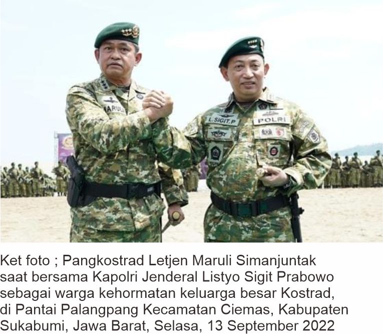Penyematan baret dan brevet warga kehormatan Kostrad terhadap Kapolri tersebut dilaksanakan usai Upacara penutupan latihan standardisasi prajurit Kostrad di Pantai Palangpang Kecamatan Ciemas, Kabupaten Sukabumi, Jawa Barat, Selasa, 13 September 2022.