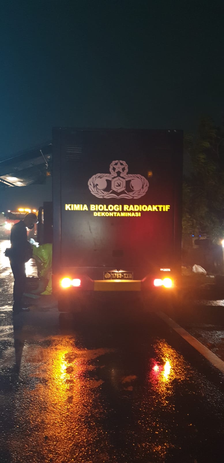 Dalam pelaksanaan evakuasi, Dirlantas Polda Banten langsung berkoordinasi dengan Satbrimob Polda Banten untuk membantu penanggulangan bahan kimia yang tumpah dari kendaraan Truk Tangki.