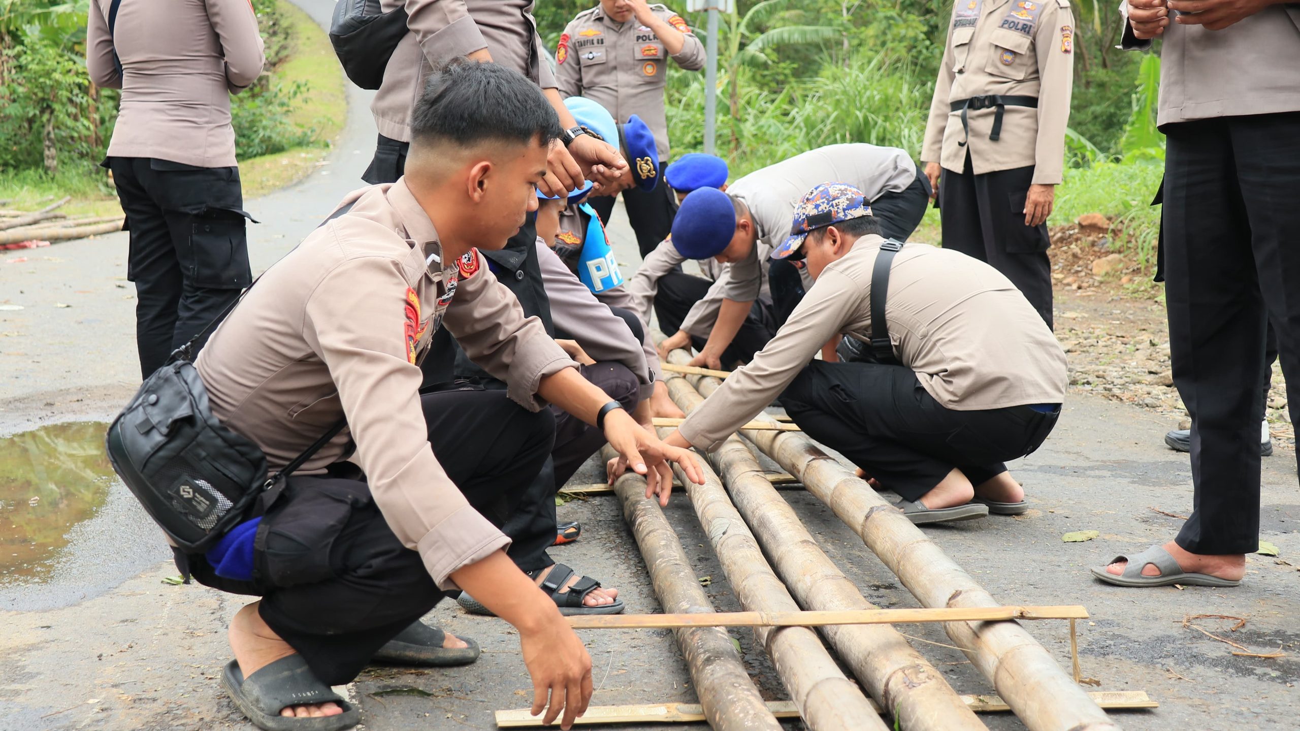 Ditpolairud polda jabar membangun jembatan darurat bagi para warga dikawasan Sangrawayang dan Girimukti. Puluhan personel yang tergabung dari ditpolairud polda jabar dan satpolairud polres sukabumi bahu membahu membangun jembatan darurat, Jumat (6/12).