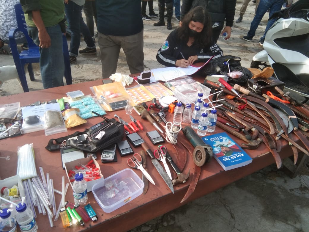 Dari penangkapan tersebut ada 26 tersangka yang ditemukan dibagi lagi menjadi 2 kelompok yaitu 18 orang laki-laki, dan 8 orang perempuan. Dari hasil penangkapan tersebut ditemukan beberapa barang bukti yang cukup banyak dan kuat yaitu: Narkotika jenis sabu, yang tiap jumlah dan ukurannya berbeda, ada 40 bungkus kecil, 2 bungkus sedang dan 4 bungkus besar, ada juga barang bukti lain yang ditemukan seperti: 6 bungkus plastic besar tembaga sintesis, 1.500 butir ecstasy, uang yang memiliki jumlah sebesar 35 juta rupiah, R2 sebanyak 22 unit, senjata tajam sebanyak 80 unit, timbangan digital sebanyak 25 unit, Bong dari botol Aqua yang berjumlah kurang lebih 150 unit, sedotan plastic, plastic klip, kartu ATM, korek api gas sebanyak 125 buah, gergaji dan korek api yang memiliki model pistol.