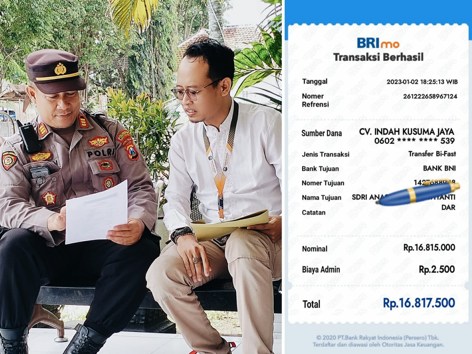 Di tanggal yang sama, pada pukul 18:27 WIB nomer WhatsApp 0821-1906-8069 atas nama Ida Santi mengirimkan bukti transfer yang discreenshot. Tertera sumber dana atau pengirim ialah CV.INDAH KUSUMA JAYA dengan tujuan ke rekening Sekretaris Kantor Villa di Bank BNI dengan No. Rekening: 14276xx948.