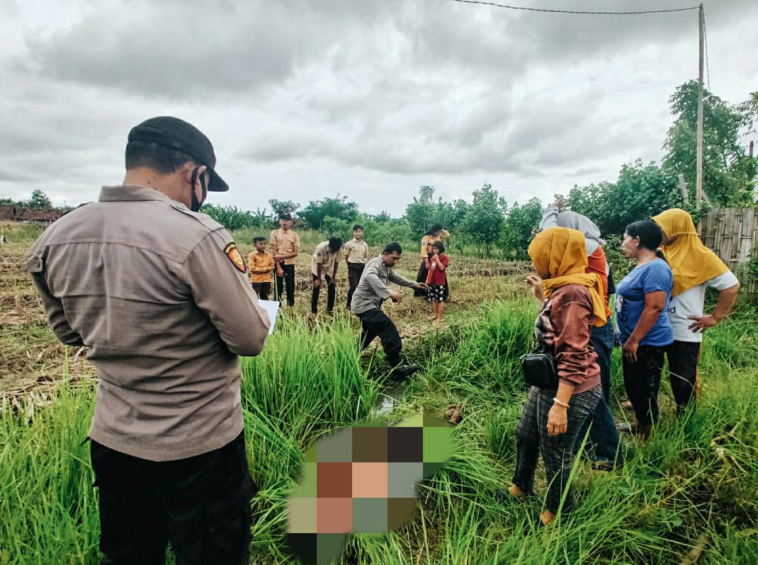 Tiba-tiba, dia dikejutkan oleh sosok laki-laki dengan posisi tubuh telungkup dan wajah masuk ke parit atau aliran air irigasi sawah.