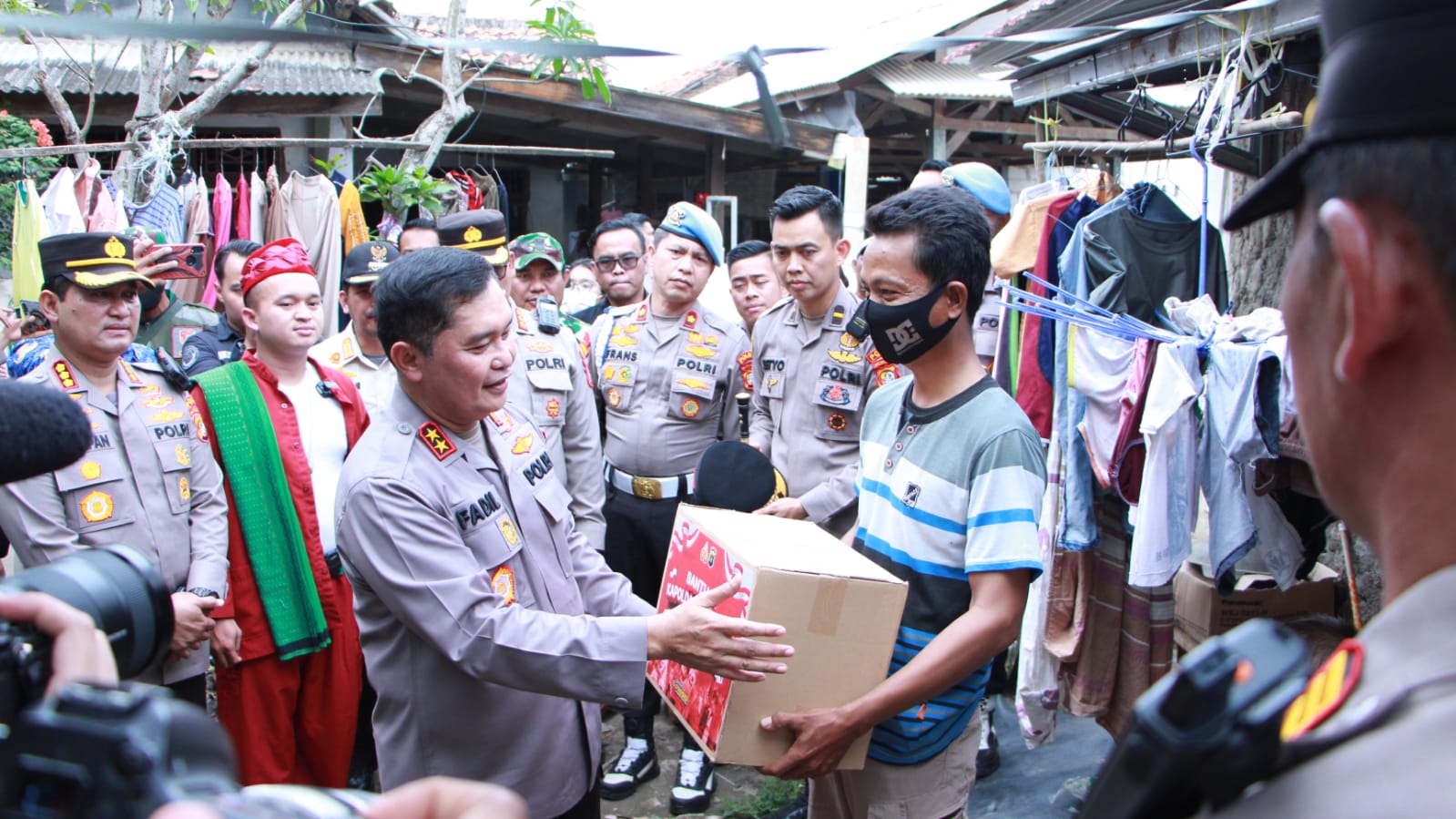 Diakhir kunjungannya, Kapolda Metro Jaya yang didampingi Camat Muara Gembong, Kabid Humas Polda Metro Jaya Kombes Endra Zulpan dan Kapolres Metro Bekasi Kombes Gideon, membagikan 50 paket sembako kepada masyarakat Muara Gembong.(Rizky)