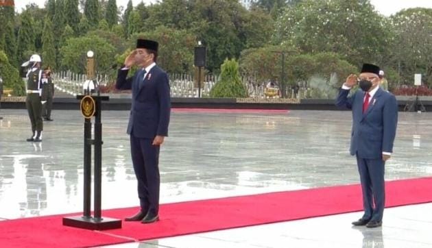 Presiden beserta Ibu Iriana Joko Widodo dan Wakil Presiden Ma’ruf Amin beserta Ibu Wury Ma’ruf Amin tiba di tempat upacara sekitar pukul 07.55 WIB.