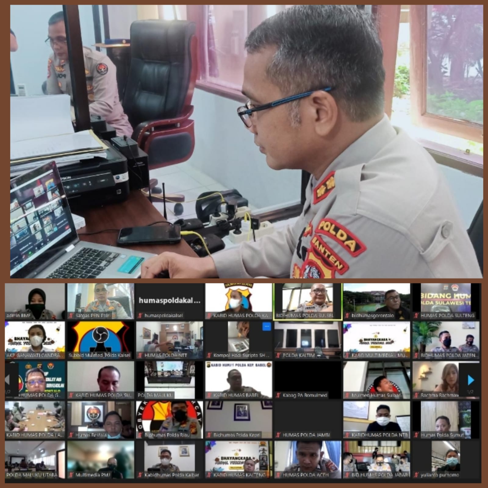 SERANG – potensinusantara.co.id – Kabid Humas Polda Banten AKBP Shinto Silitonga mengikuti video conference dengan Divhumas Polri tentang kesiapan pelaksanaan Festival Mural Bhayangkara Piala Kapolri 2021, di Ruang Kerjanya, Senin (18/10).
