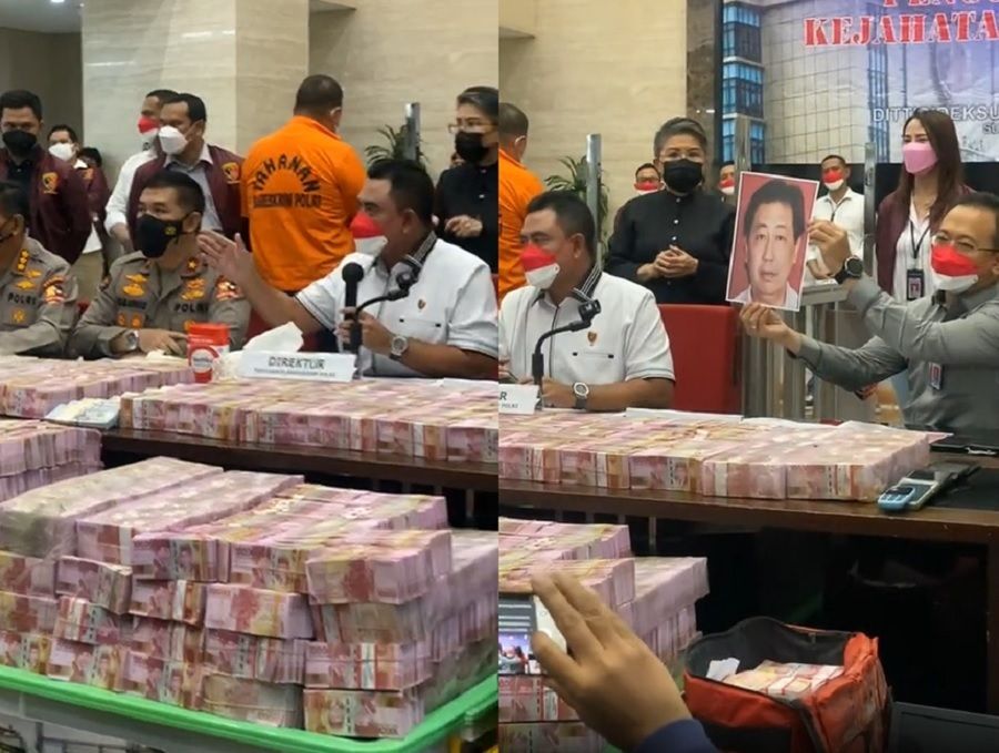 Saat jumpa pers di Mabes Polri, terlihat tumpukan uang menggunung dari hasil penyitaan kasus Indosurya. Uang terebut pecahan 100 ribuan.