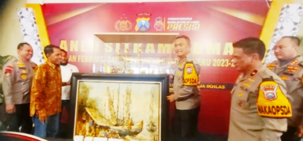 Sebelum acara Anev dimulai, Kapolda Jatim Irjen Pol Imam Sugianto menerima cenderamata berupa lukisan karya Mozes Misdy dari owner Langgar Art Imam Maskun