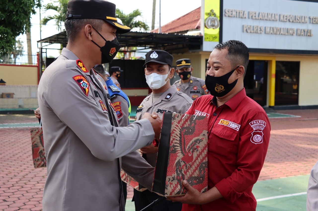 Potensinusantara.co.id- Kapolres Madina AKBP H.M. Reza Chairul A.S, S.I.K, S.H, M.H memberikan surprise atau kejutan berupa nasi tumpeng dan bakal/kain baju dinas Polri kepada personil Polres Madina yang berulang tahun pada bulan Januari di halaman apel Mako Polres Madina, hari Senin (31/01/2022) sekira pukul 08.30 Wib.