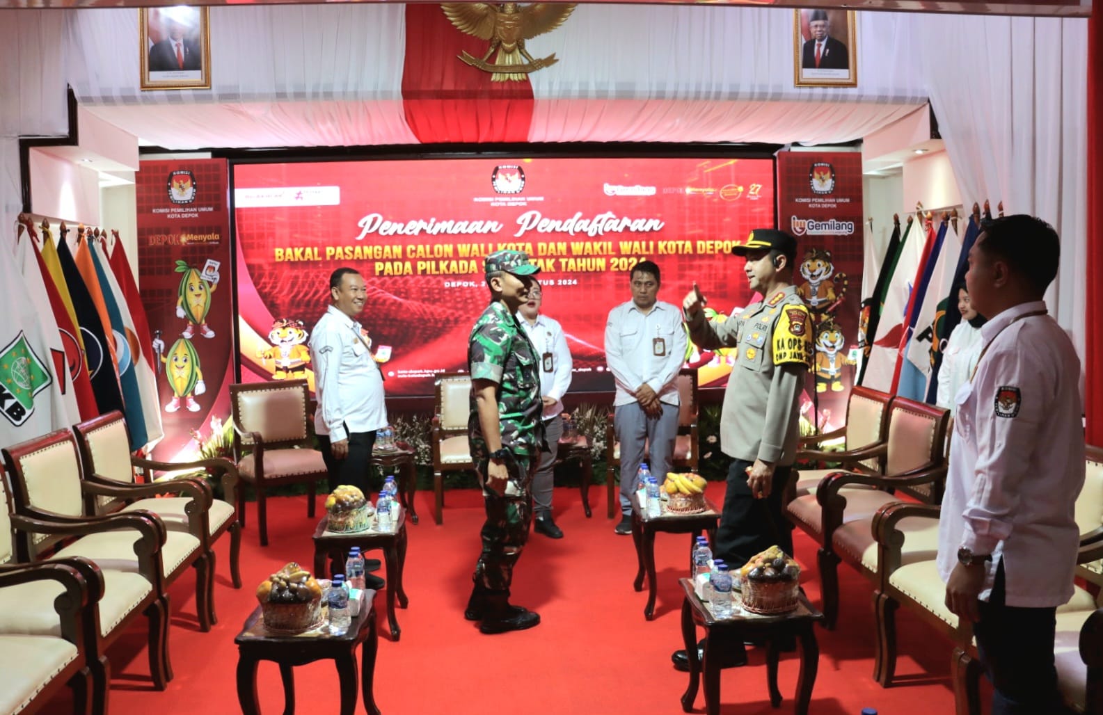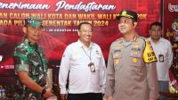 DEPOK – potensinusantara.co.id – Kapolres Metro Depok, Kombespol Arya Perdana, SH., SIK., MSi., bersama Dandim 0508/Depok Kol Inf Iman Widhiarto, turut serta dalam pengamanan jalannya proses pendaftaran paslon Walikota Depok di Kantor Komisi Pemilihan Umum (KPU) Kota Depok. Kombespol Arya Perdana yang didampingi oleh sejumlah Pejabat Utama Polres Metro Depok, memastikan bahwa pengamanan berjalan lancar dan tertib di lokasi tersebut.