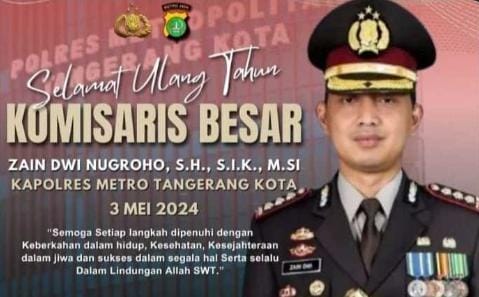 TANGERANG – potensinusantara.co.id – 3 Mei 2024 – Kombes Pol Zain Dwi Nugroho S.H., S.I.K., M.Si, Kapolres Metro Tangerang Kota, merayakan ulang tahun nya hari ini.
