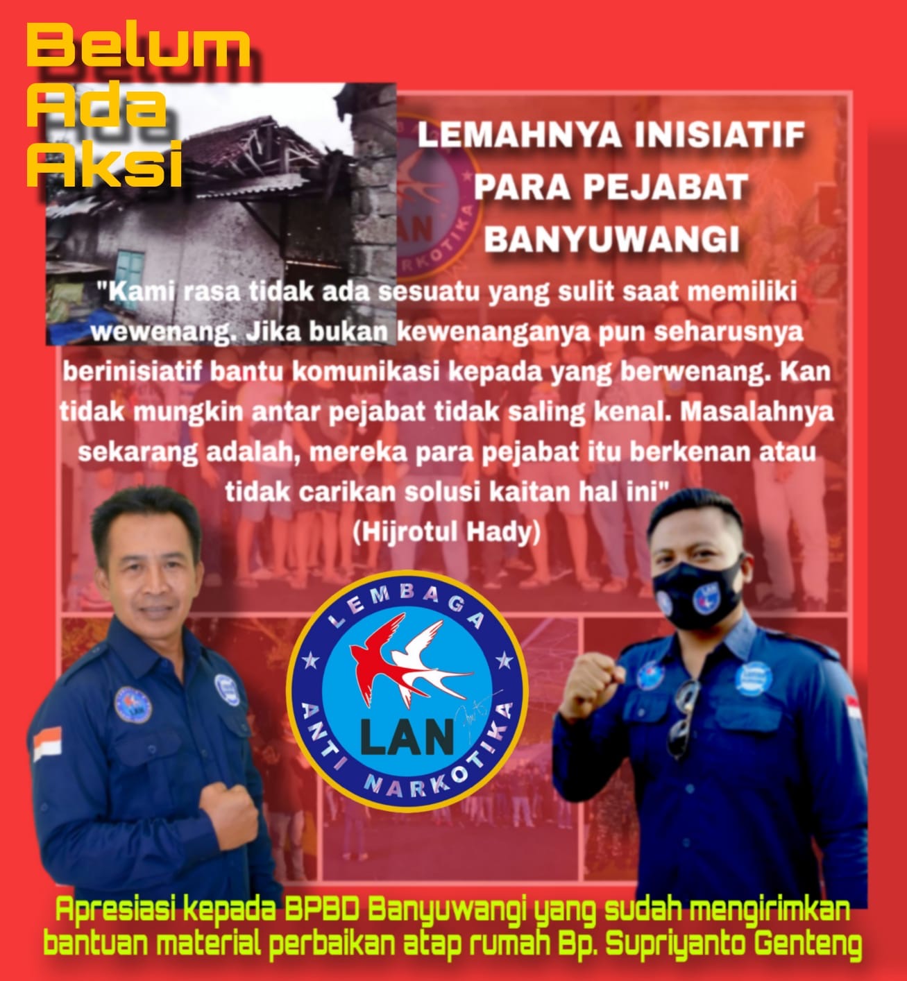 Alif HW, ketua harian LAN Banyuwangi mengatakan, “Apresiasi dan terimakasih untuk Pak Danang Kepala BPBD Banyuwangi yang telah mengirimkan bantuan sebagian material, asbes, kayu usuk dan kayu balok”, kata Alif HW.