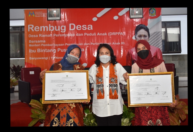 KAB. BANYUWANGI, potensinusantara.co.id – – Menteri Pemberdayaan Perempuan dan Perlindungan Anak (PPPA), Bintang Puspayoga menyaksikan pencanangan model Desa Ramah Perempuan dan Peduli Anak (DRPPA) di 2 desa di Kabupaten Banyuwangi oleh kepala desa dan perangkat desa. Pencanangan Desa Kepundungan dan Desa Watukebo menambah kembali daftar desa yang sudah menjadi model DRPPA pada 2021, dengan harapan akan terus bertambah ke depannya sehingga upaya mempercepat perlindungan terhadap perempuan dan anak dapat tercapai.