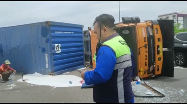 Truk kontainer diduga melaju dengan kecepatan tinggi di area berbelok di pintu keluar Margona tol Cijago arah Jalan Juanda Depok. Akibatnya truk terguling.