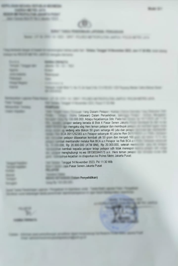 Korban melaporkan kejadian ini ke Polres Metro Jakarta Pusat dengan nomor LP/B/2751/XI/2023/POLRES METROPOLITAN JAKPUS/POLDA METRO JAYA terkait Kasus Penipuan.