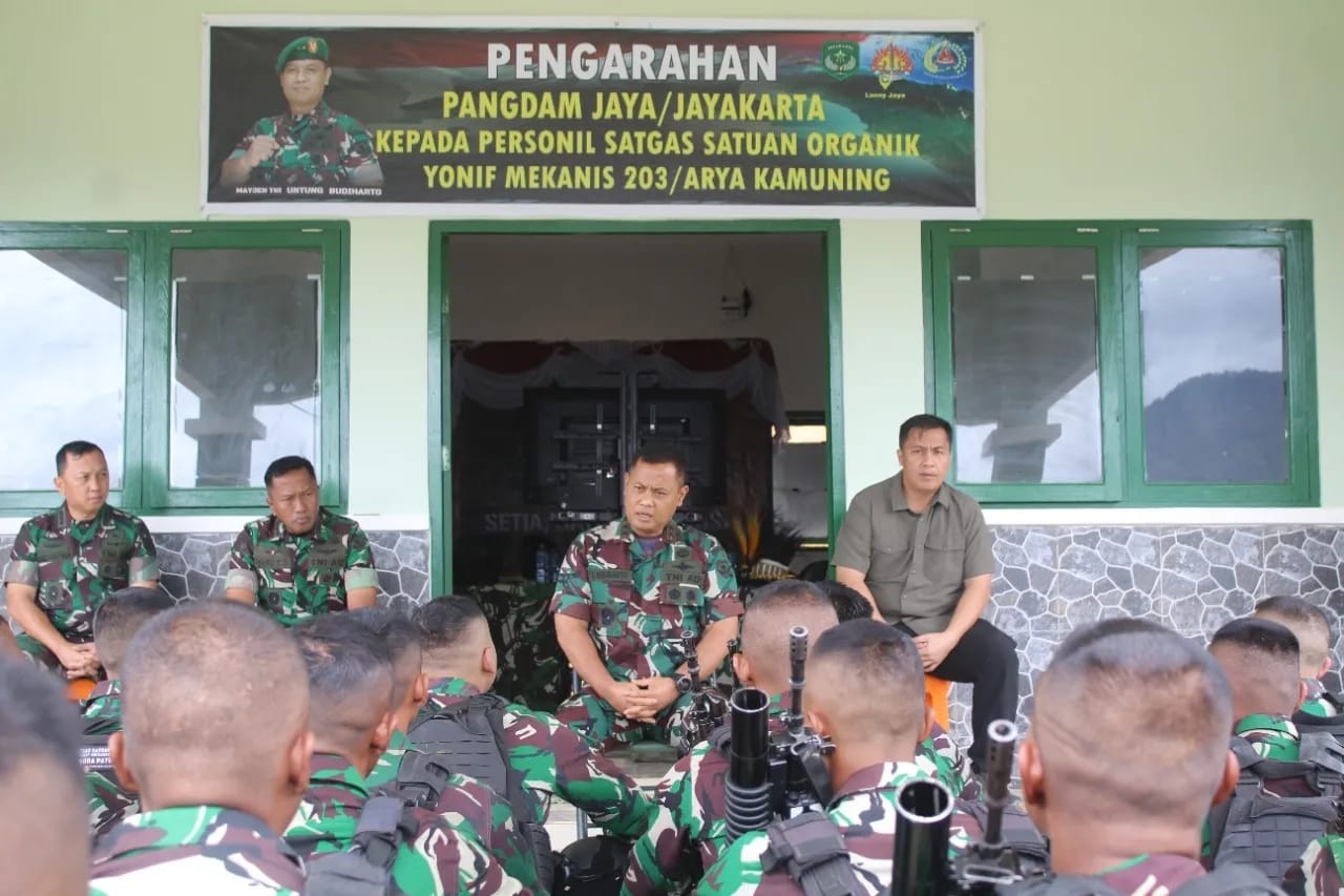 PAPUA – Potensinusantara.co.id – Dibawah pimpinan Danyonif Mekanis 203/AK Mayor Inf Achmad Zaki, Pangdam Jaya Mayjen TNI Untung Budiharto memberikan pengarahan dan motivasi kepada personel Satgas bertempat di Posko Satgas Yonif Mekanis 203/AK, Kab. Lanny Jaya, Papua.