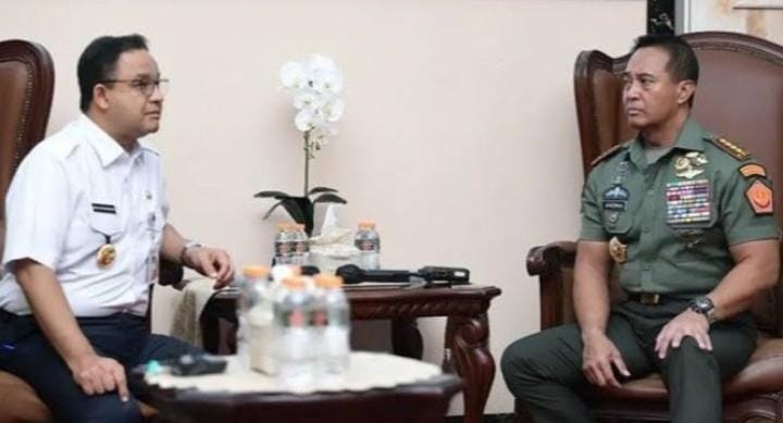 Panglima TNI Jenderal Andika Perkasa menerima kunjungan Gubernur DKI Jakarta Anies Rasyid Baswedan di Subden Mabes TNI, Jalan Medan Merdeka Barat, Jakarta Pusat, beberapa waktu lalu. Momen pertemuan keduanya diunggah di akun Youtube Jenderal TNI Andika Perkasa pada Jumat (14/10).