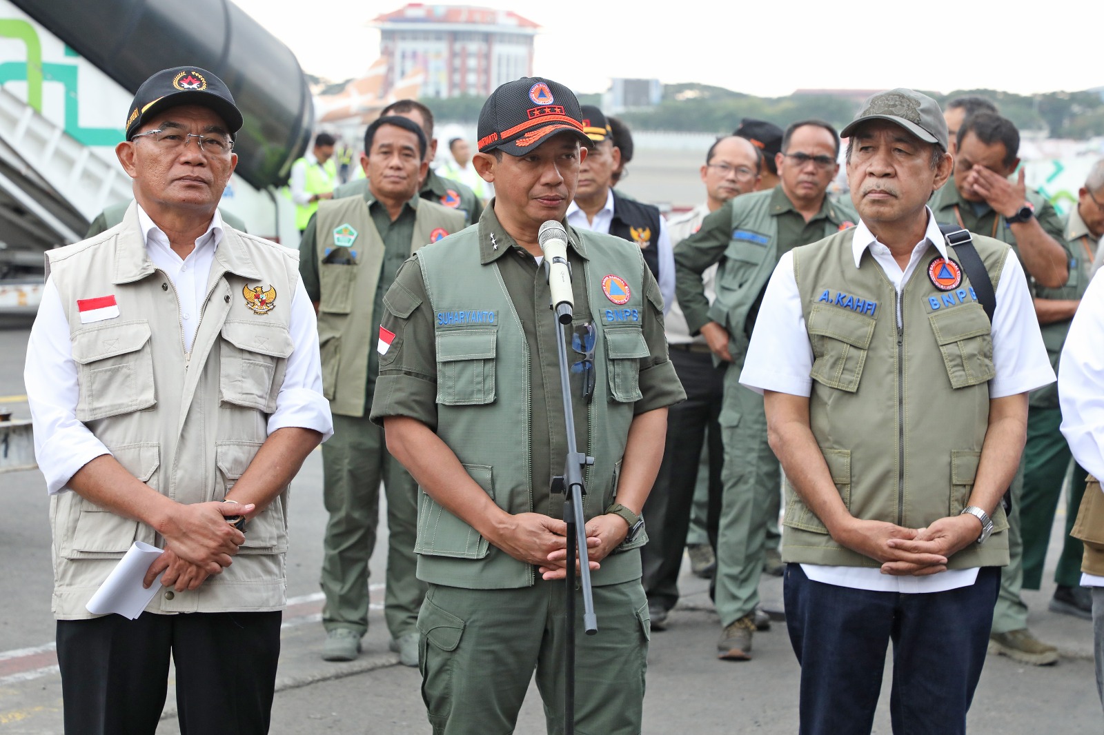 Usai memberikan keterangan resmi, rombongan Menko PMK, Kepala BNPB, Ketua Komisi VIII DPR RI dan delegasi lainnya kemudian memeriksa sejumlah barang yang akan diterbangkan ke Vanuatu dan dilanjutkan naik ke pesawat Garuda Indonesia jenis Boeing 737-800 dengan nomor penerbangan GA 7380 dan My Indo Airlines No.2Y-729 (sultan)
