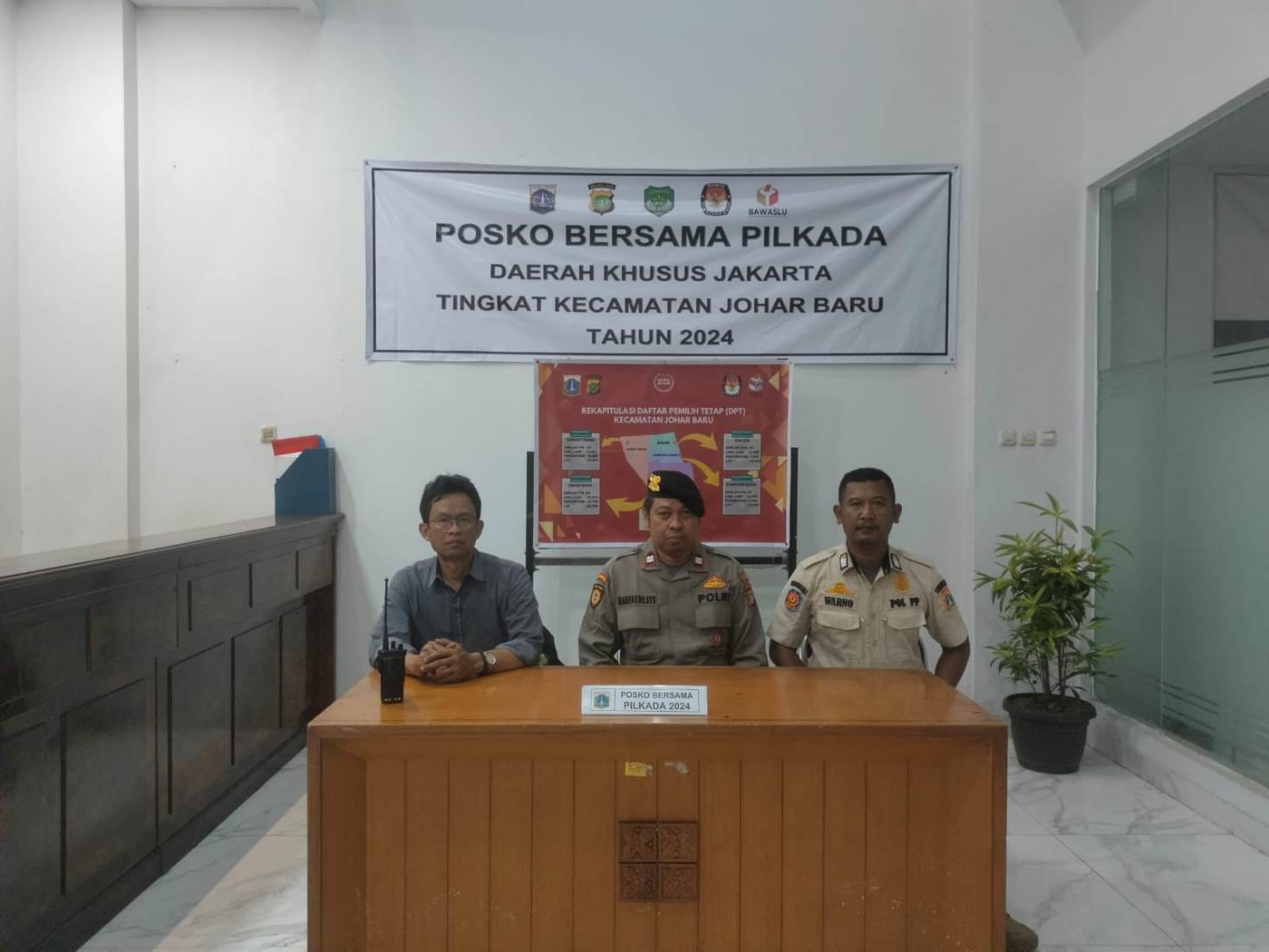 JAKARTA PUSAT – Potensinusantara.co.id – Kanit Intelkam Polsek Johar Baru Iptu Hilal Sugiarto, S.H., bersama Anggota Patroli, Satpol. PP., Panwascam dan FKDM, melaksanakan pengamanan Gudang Logistik Pilkada Tahun 2024 di Posko Bersama Pilkada Kantor Kecamatan Johar Baru, Jalan Johar Baru Utara I No 1 RT 12 RW 03 Kelurahan Johar Baru, Kecamatan Johar Baru Jakarta Pusat, pada Jum’at malam (18/10/2024) pukul 22.00 WIB.