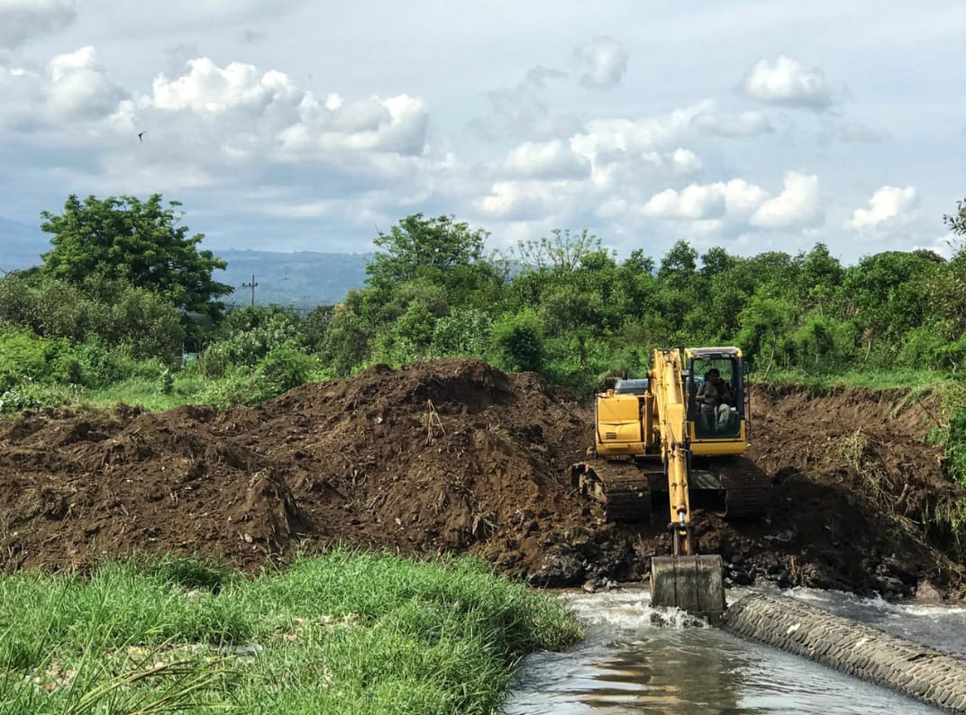 Satu alat berat ekskavator diterjunkan untuk melakukan pengerukan sedimentasi dan pembongkaran bendungan sungai sesuai permintaan warga setempat.