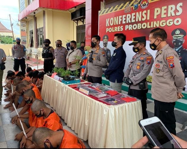 “Setelah melakukan penyelidikan, pada tanggal 01 Januari 2022 dini hari petugas berhasil melakukan penangkapan terhadap 10 tersangka yang merupakan pemilik tanaman ganja dan beberapa paket plastik berisi ganja kering di salah satu gudang milik pelaku di Desa Wonotoro Kecamatan Sukapura, dengan barang bukti berupa 17 tanaman ganja (diperkirakan usia tanam 4 bulan), 20 tanaman ganja di satu bedeng (diperkirakan usia tanam 2 minggu) serta 4 paket klip berisi ganja kering ” kata Kapolres Probolinggo AKBP Teuku Arsya Khadafi saat konferensi pers di halaman Mapolres Probolinggo, Selasa, (04/01)