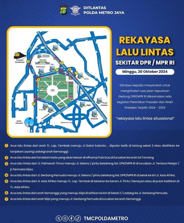 Dirlantas Polda Metro Jaya, Kombes Latif Usman, menyatakan bahwa rekayasa lalu lintas akan diberlakukan secara situasional di sekitar gedung DPR/MPR RI.