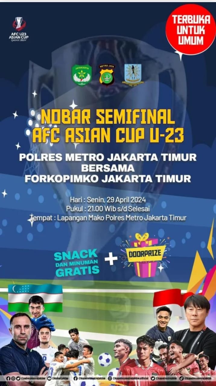 “Kami mengajak masyarakat Jakarta Timur untuk bersama-sama hadir nonton bareng (nobar) di Polres Metro Jakarta Timur, sebagai bentuk dukungan untuk Garuda Muda serta mempererat silaturahmi antara keluarga besar Polres Metro Jakarta Timur dengan masyarakat,” ujarnya.