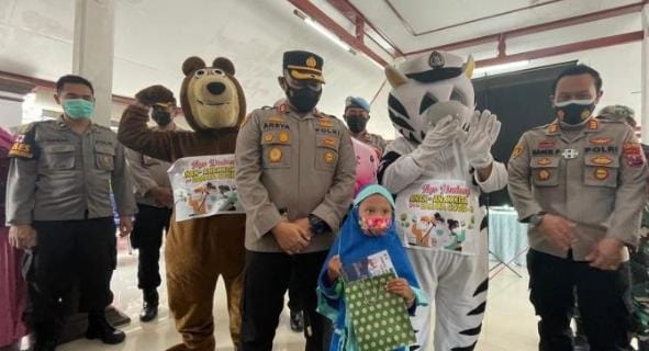 “Kami (Polres Probolinggo) terus menggencarkan vaksinasi anak, agar kekebalan tubuh mereka (anak) meningkat dan terhindar dari bahaya covid-19, maka sengaja kami hadirkan dua badut dari anggota bhabinkamtibmas untuk menghibur dan menarik minat anak saat mengikuti vaksinasi,” kata Kapolres Probolinggo, AKBP Teuku Arsya Khadafi.Jumat (14/01).