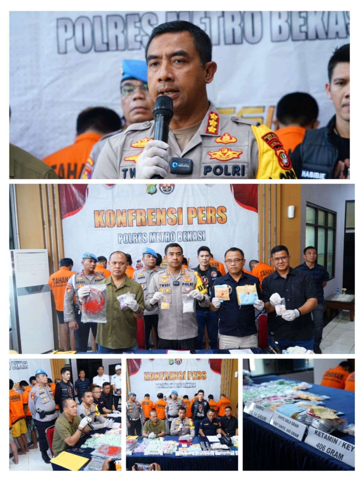 Dalam Konferensi Pers, Kapolres Metro Bekasi menjelaskan bahwa dalam operasi tersebut, pihak Kepolisian berhasil mengamankan sejumlah barang bukti, yaitu Sabu : 212,14 Gram, Ganja : 529,87 Gram, Sinte : 288,8 Gram, Bibit Sinte : 445 Gram, Ekstasi : 5.808 Butir, Obat Ketamin : 406 Gram, Motor : 1 Unit, Hp : 11 Unit, Timbangan Elektrik : 5 Buah Jika diakumulasikan dalam rupiah barang bukti seluruhnya setara dengan kurang lebih Rp. 7.073.242.545,- (Tujuh Miliyar Tujuh Puluh Tiga Juta Dua Ratus Empat Puluh Dua Ribu Lima Ratus Empat Puluh Lima Rupah)