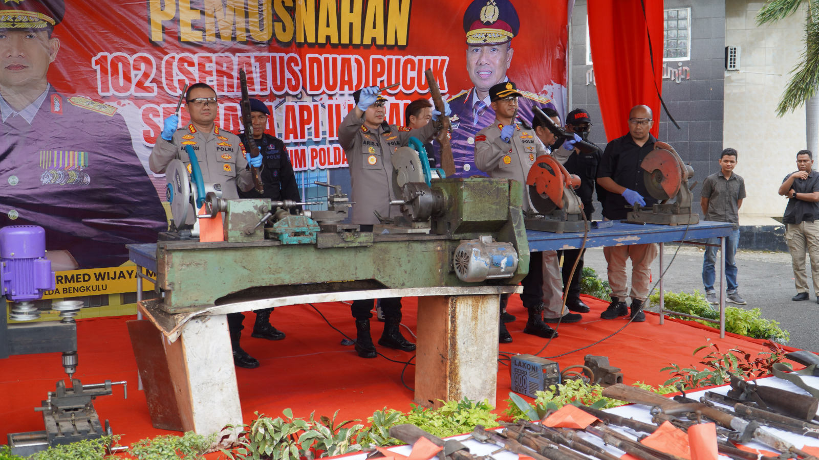 saat tim gabungan Polda Bengkulu yang terdiri dari Reskrimum, Reskrimsus, Polresta Bengkulu, Polres Kaur, serta kompi 3 Pelopor Sat Brimobda Polda Bengkulu mendapat informasi masyarakat, bahwa di Kabupaten Kaur terdapat home industri pembuatan senjata api (Senpi) ilegal.