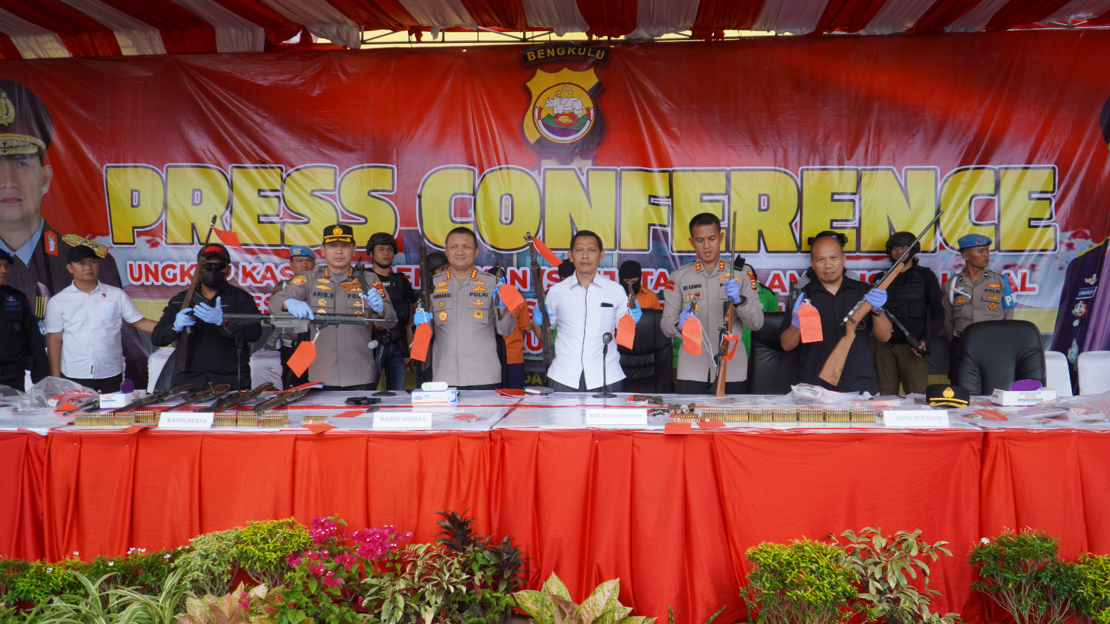 hal tersebut diungkapkan oleh Kabid Humas Polda Bengkulu Kombes Pol Anuardi, S.Ik., M.Si., didampingi Wadir Reskrimum Polda Bengkulu AKBP Pol Andjas, Kabag Wasidik Reskrimsus AKBP Suparman, Kapolresta Bengkulu Kombes Pol Aris Sulistyono, S.H, serta Kasatgas Wilayah Bengkulu Densus 88 / AT saat Press Conference sore ini (04/04/23) di Lapangan Mapolda Bengkulu.