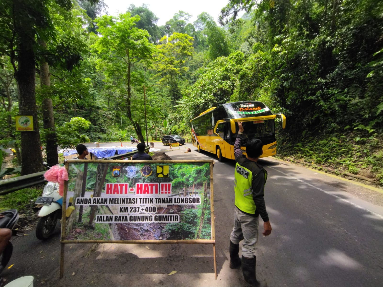Buka tutup jalur dikarenakan adanya longsor yang memakan hampir separuh jalan. Perbaikan jalan dan tebing yang longsor masih dikerjakan.