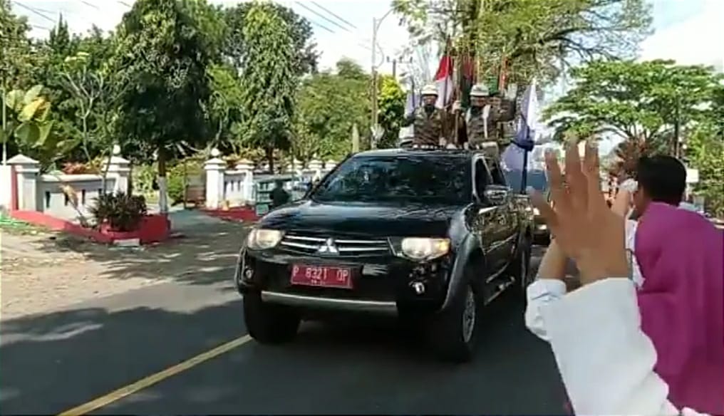 Iring-iringan kirab yang terdiri dari mobil patwal, mobil pembawa pataka, dan kendaraan tambahan lainnya itu disambut langsung oleh Bupati Banyuwangi Ipuk Fiestiandani.