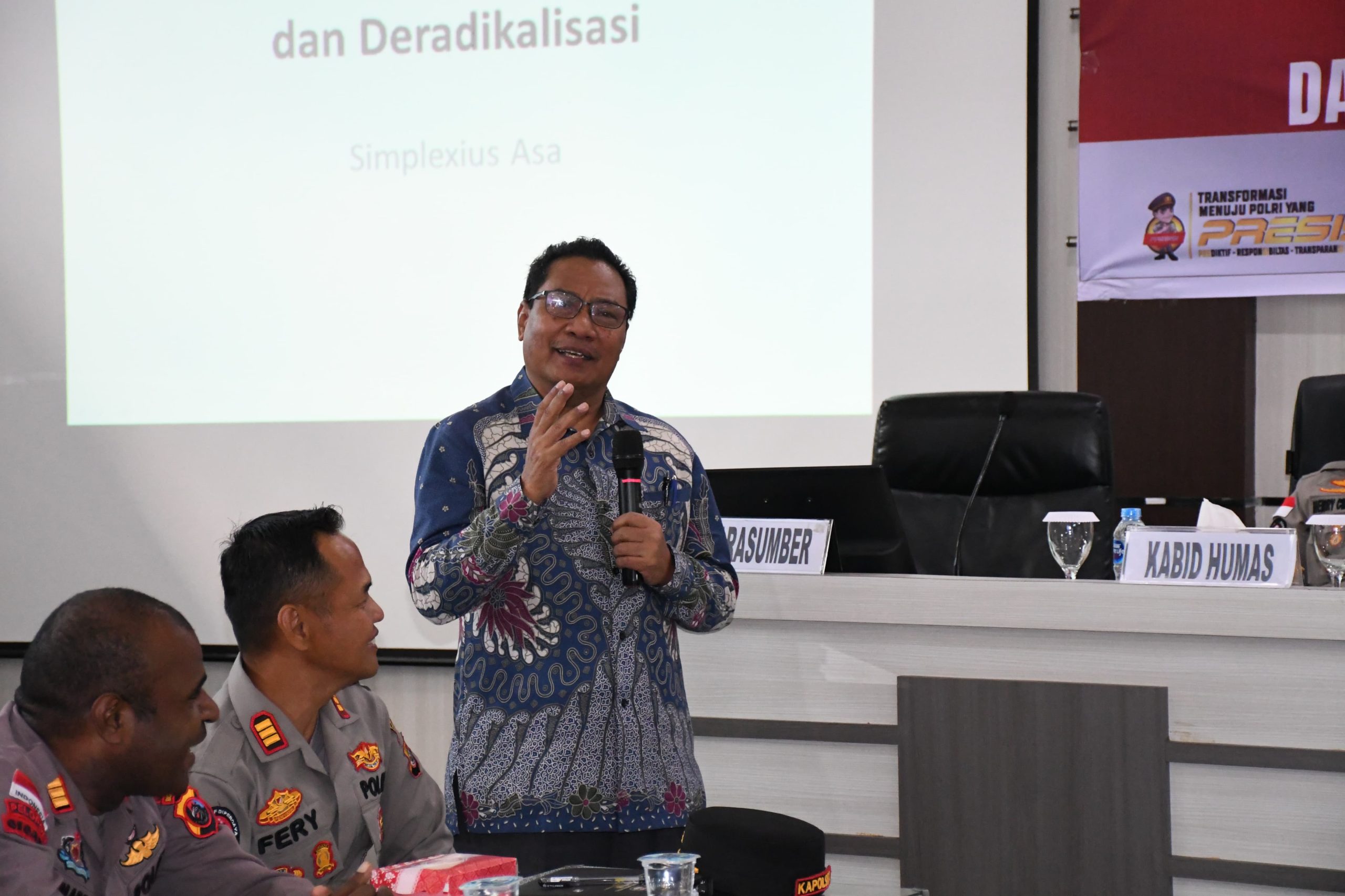 Sebagai narasumber utama, hadir Dr. Simplexius Asa, SH, MH., akademisi dari Universitas Nusa Cendana Kupang, yang memaparkan pentingnya pelibatan masyarakat sipil dalam menangkal radikalisme secara sistemik. Ia mendorong pentingnya membangun kesadaran bersama bahwa keamanan ideologis bangsa tidak bisa dipikul oleh negara saja, tetapi harus menjadi gerakan publik yang masif. Diskusi diikuti oleh sekitar 60 peserta dari berbagai kalangan, mulai dari anggota Polri, mahasiswa, tokoh agama, tokoh masyarakat, hingga unsur pemerintahan. Para peserta terlibat aktif dalam sesi tanya jawab yang membahas strategi menangkal radikalisme di lingkungan kampus, media sosial, dan komunitas lokal.