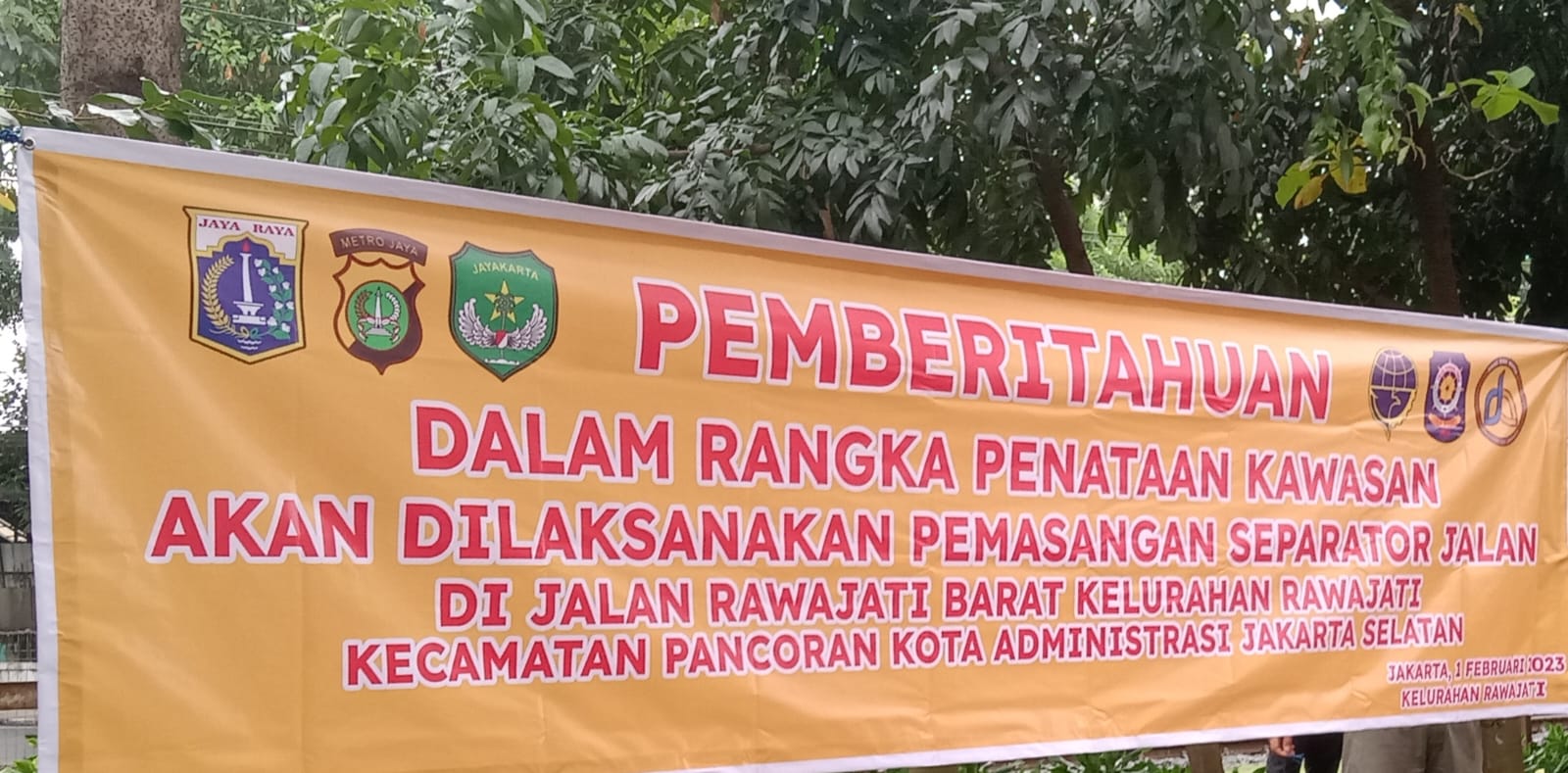Pasalnya, di lokasi jalan Rawajati Barat, tepatnya samping Apartemen Kalibata City, terlihat sebuah spanduk Himbauan yang terlulis “Pemberitahuan, Dalam Rangka Penataan Kawasan Akan Dilaksanakan Pemasangan Separator di Jalan Rawajati Barat Kelurahan Rawajati Kecamatan Pancoran Kota Administrasi Jakarta Selatan”.