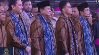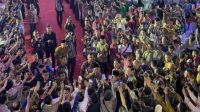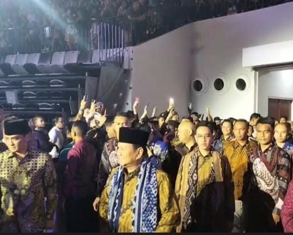 Sebelum memasuki venue, Prabowo juga menyalami sejumlah orang yang berdiri berjejer hingga venue.