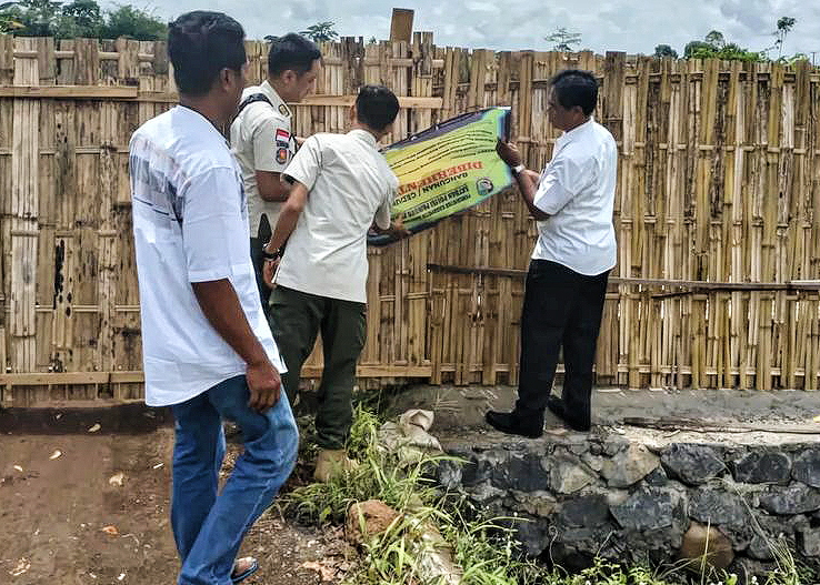 Papan yang dipasang Satpol PP Banyuwangi bertuliskan “Bangunan atau Gedung Diberhentikan Sementara”. Penindakan ini dibantu pihak dari Kecamatan Cluring.