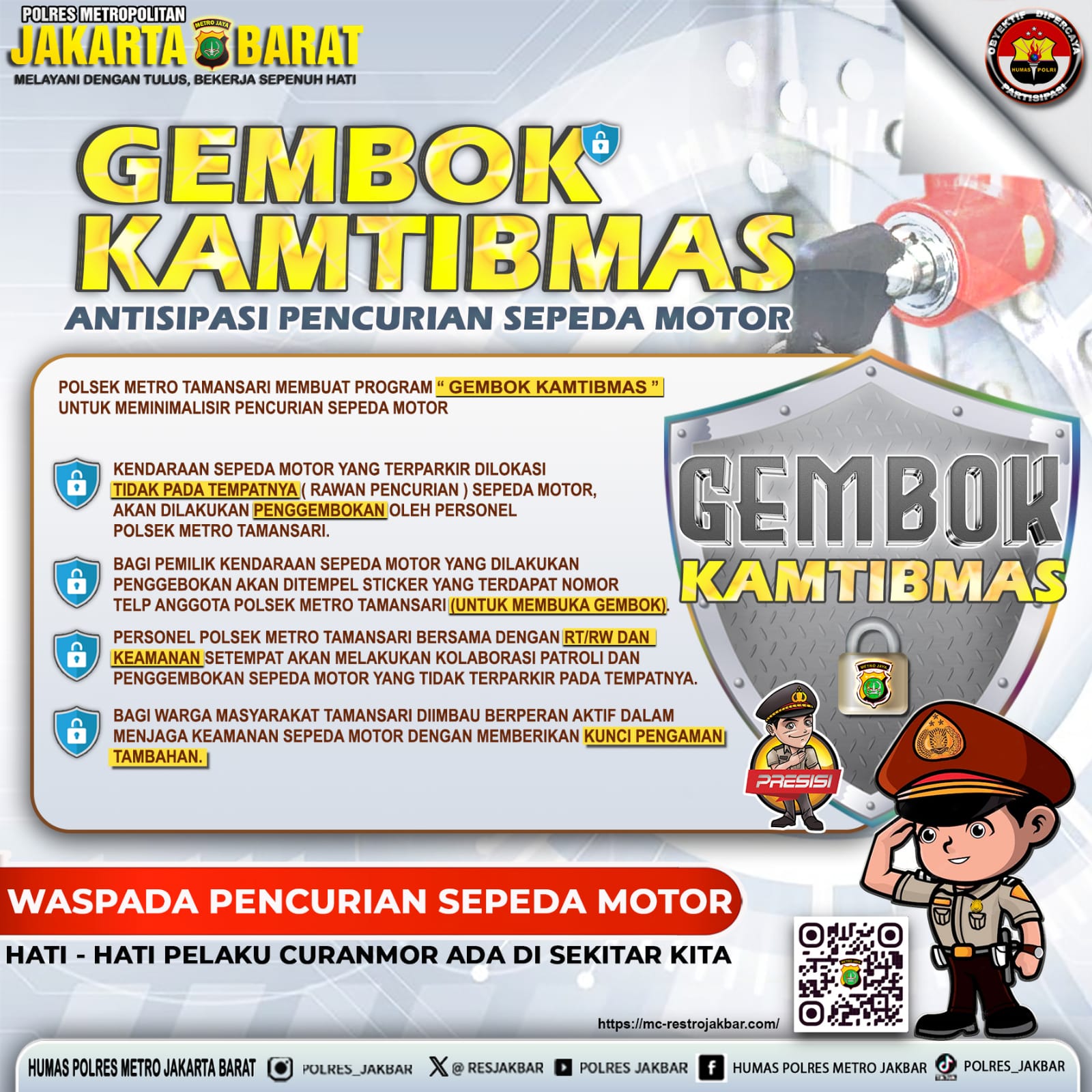 Kapolres Metro Jakarta Barat, Kombes Pol M. Syahduddi, menjelaskan bahwa pemberian gembok ini dilakukan sebagai salah satu langkah pencegahan aksi kejahatan, khususnya curanmor.