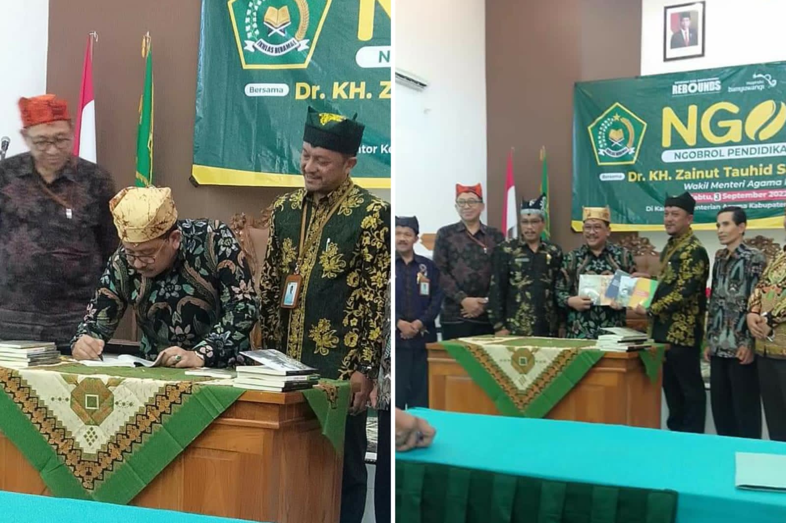 Penandatanganan buku tersebut dilakukan Wamenag Zainut Tauhid, bersamaan dengan acara “Ngopi”, Ngobrol Pendidikan Islam, yang dihadiri semua Kepala Madrasah Negeri, Pengawas Madrasah, Pengawas Pendidikan Agama Islam serta pengurus MGMP PAI dan Ketua Kelompok Kerja Kepala Madrasah (KKM) se- Kabupaten Banyuwangi.
